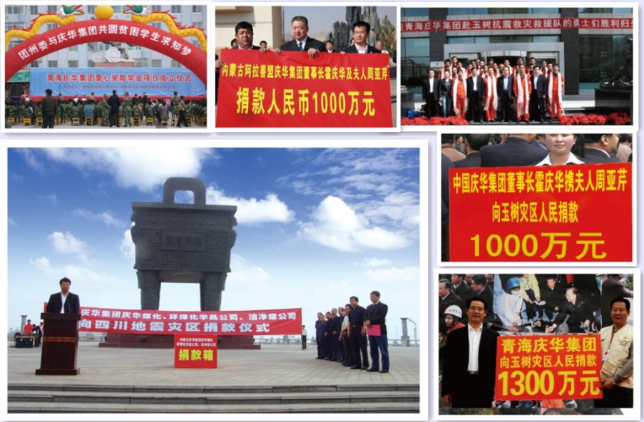 “关注公益,回报社会”,是中华民族的传统美德,也是中国庆华集团一贯坚持的社会责任。多年来,中国庆华集团在努力加快经济发展的同时,大力支持公益事业,主动加强与公益机构的沟通与交流,积极投身于国家的基础设施建设、教育、医疗、扶贫救灾等公益事业。