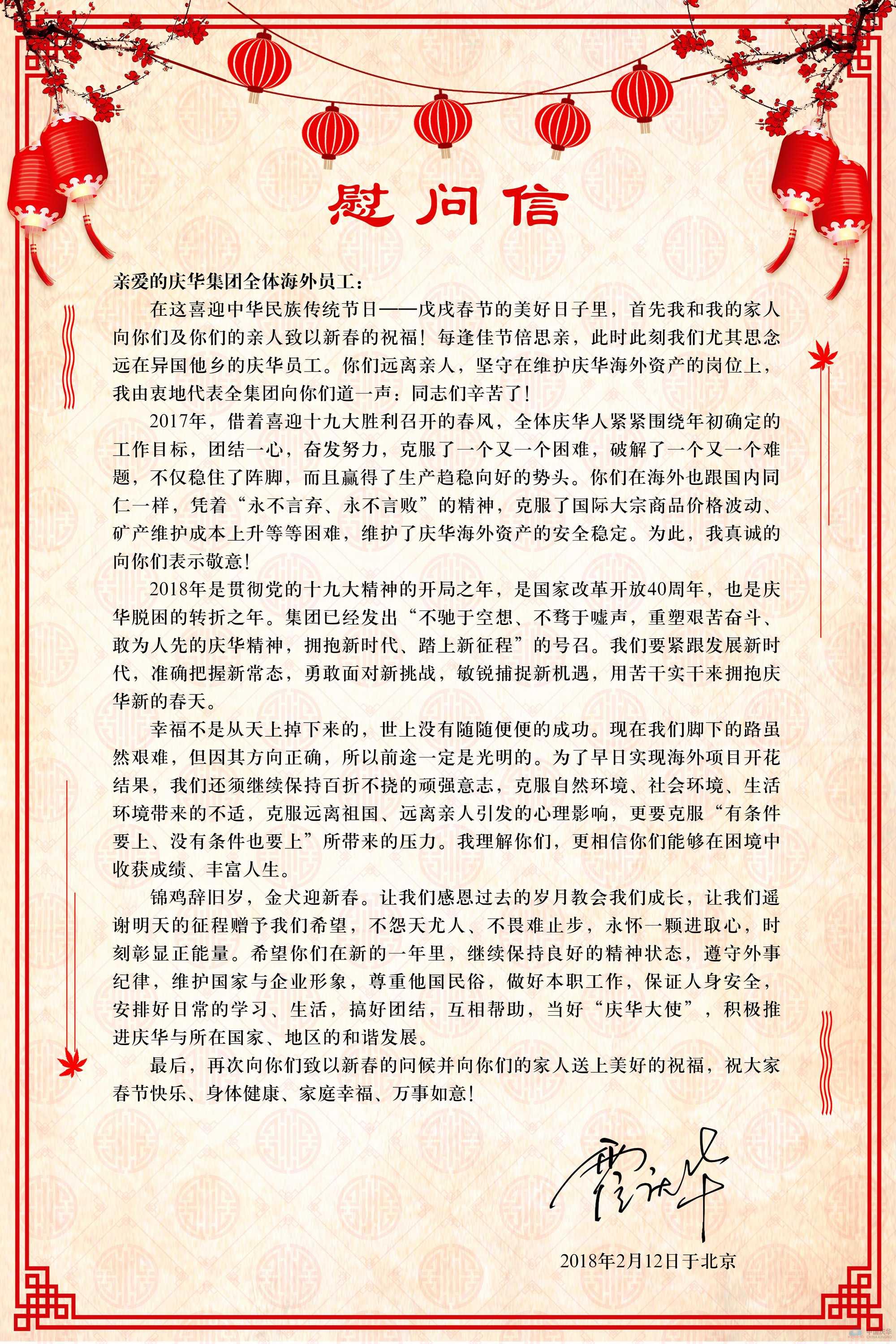 董事长给庆华集团全体海外员工的新年慰问信