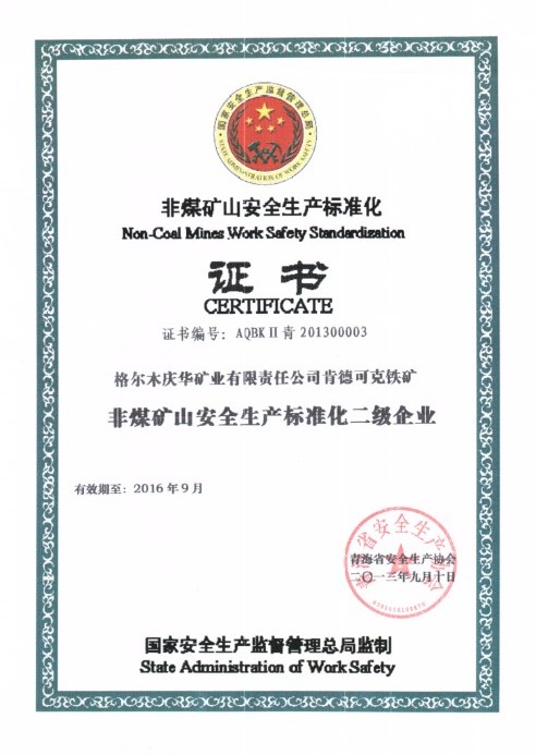 中国庆华青海消息(徐芳)近日,格尔木矿业公司肯德可克铁矿获得了青海省安全生产协会颁发的非煤矿山安全生产标准化证书和“非煤矿山安全生产标准化二级企业”称号。 矿业公司自申请矿山二级标准化验收工作以来,进一步加强了对矿山安全工作的监管,对安全管理薄弱环节、标准化工作进行了系统梳理,认真排查安全隐患,安全管理工作水平进一步挺高。 肯德可克铁矿顺利通过安全生产二级标准化验收,标志着公司安全生产标准化工作正式步入规范化管理轨道,为打造本质安全型企业奠定了坚实的基础。