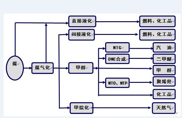 现代新型煤制油化工技术是以煤炭为基本原料,经过气化、合成、液化、热解等煤炭利用的技术途径,生产洁净能源和大宗化工产品,如合成气、天然气、柴油、汽油、航空煤油、液化石油气、聚乙烯、聚丙烯、甲醇、二甲醚等。改变传统的煤炭燃烧、电石、炼焦等以高污染、低效率为特点的传统利用方式。