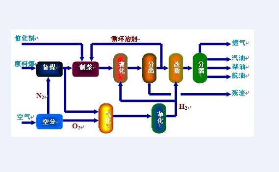 煤直接液化,将煤在氢气和催化剂作用下通过液化生成粗油,再经加氢精制转变为汽油、柴油等石油燃料制品的过程,因液化过程主要采用加氢手段,故又称煤加氢液化法。煤直接液化典型的工艺过程主要包括煤的破碎与干燥、煤浆制备、催化剂制备、氢制取、加氢液化、固液分离、液体产品分馏和精制,液化大规模制备氢气通常采用煤气化或者天然气转化。