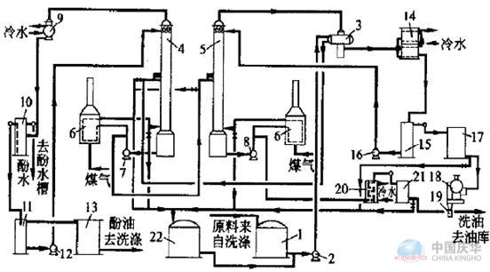 注:(1—原料槽;2—原料泵;3—原料与工业萘换热器;4—初馏塔;5—精馏塔;6—管式炉;7—初馏塔热油循环泵;8—精馏塔热油循环泵;9酚油冷凝冷却器;10—油水分离器;11—酚油回流槽;12—酚油回流泵;13—酚油槽;14—工业萘汽化冷凝冷却器;15—工业萘回流槽;16—工业萘回流泵;17—工业萘贮槽;18—转鼓结晶机;19—工业萘装袋自动称量装置;20—洗油冷却器;21—洗油计量槽;22—中间槽)