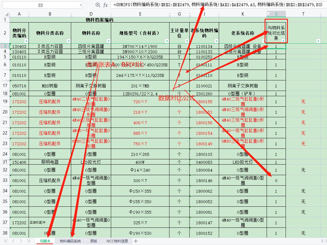 S列值为1,说明其物料编码及分类名称符合规定,为零则说明与规定存在差异(本例中乌斯太S33为0,是由于压缩机配件分类编码是错误的)。