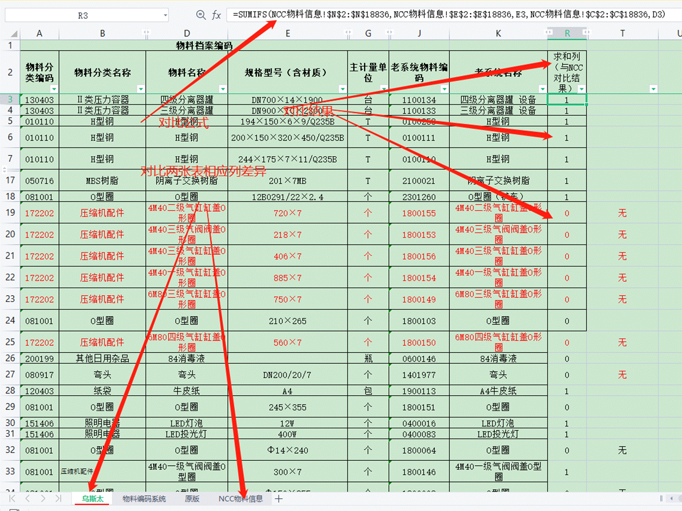 例2:8月,我们将部分公司物料基础信息导入到了NCC系统,但对于导入的错误直接在NCC系统修改而未能同步更正导入模板数据,且部分公司在导入本公司基础数据后又进行了修改,因此NCC系统与各公司修改的物料信息存在差异。我们利用SUMIFS求和函数转换成查找差异公式。
